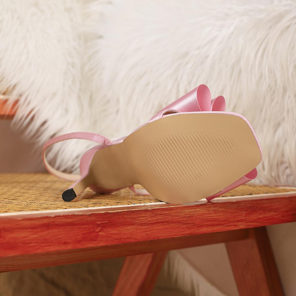 حذاء بكعب ستيليتو مزين بفيونكة مرصعة بأحجار الراين وحزام حريري، مقدمة دائرية، وحزام حريري.