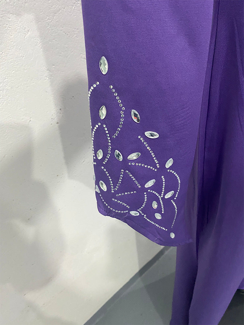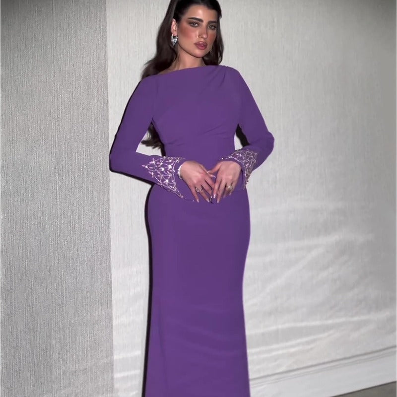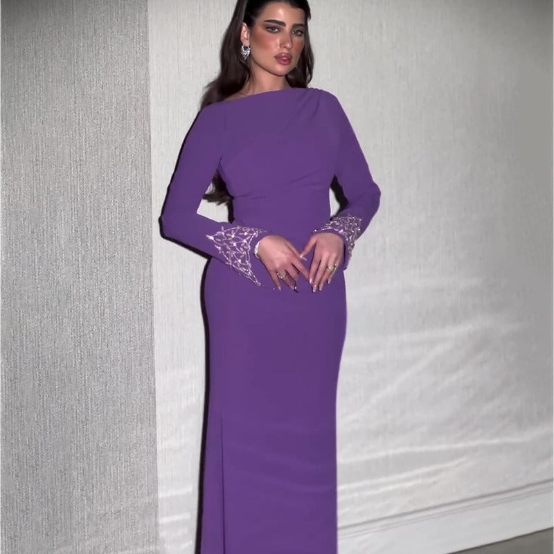 فستان طويل بأكمام طويلة بلون صلب من الخريف مصنوع يدويًا مزين بحجارة الراين