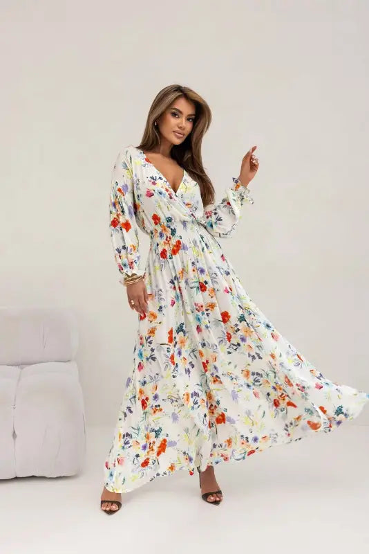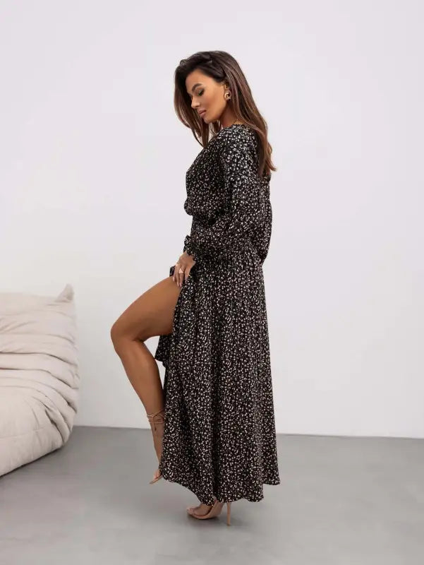 فستان أنيق بأكمام طويلة مع شق جذاب وتصميم مزخرف بالورود