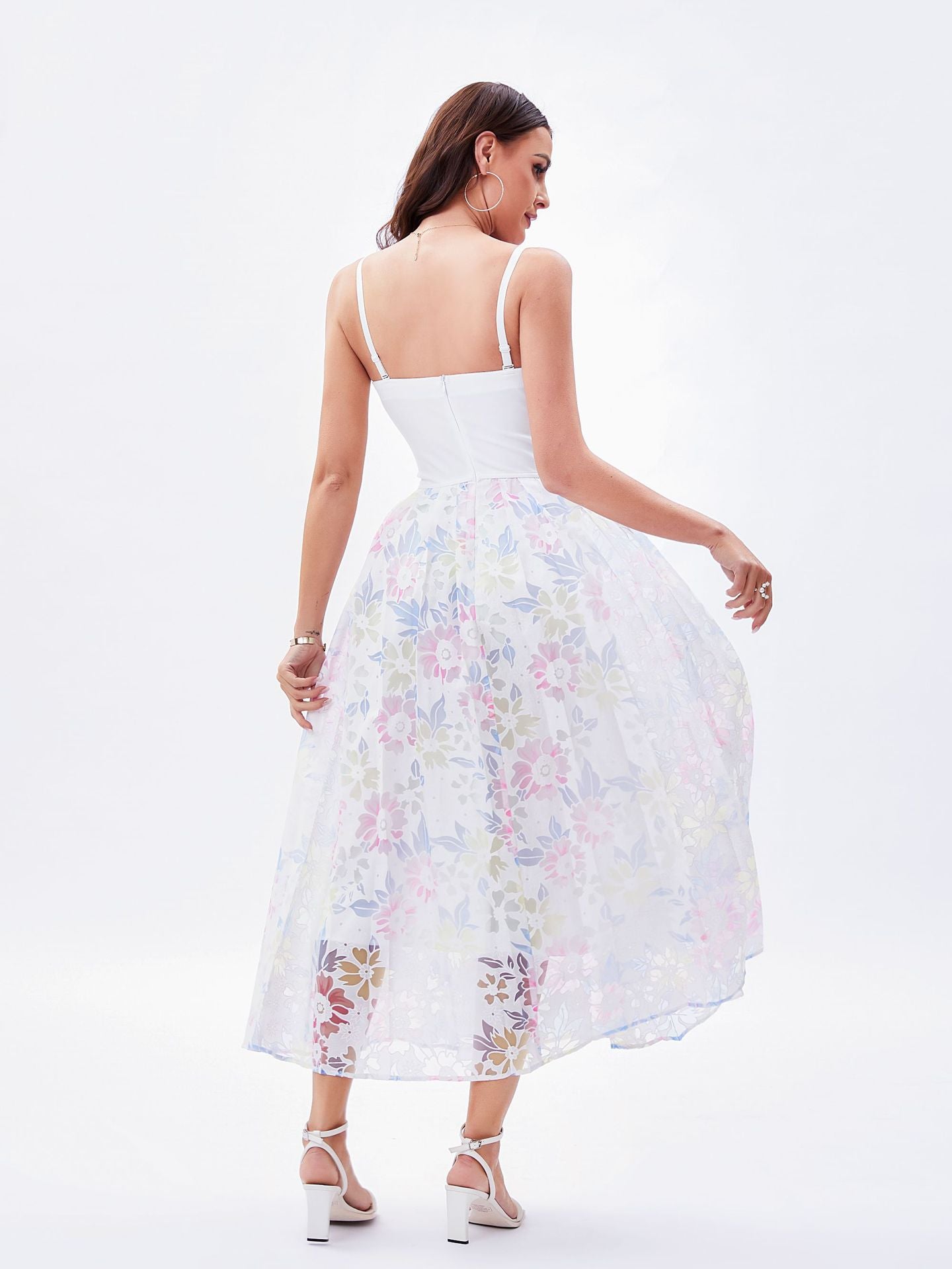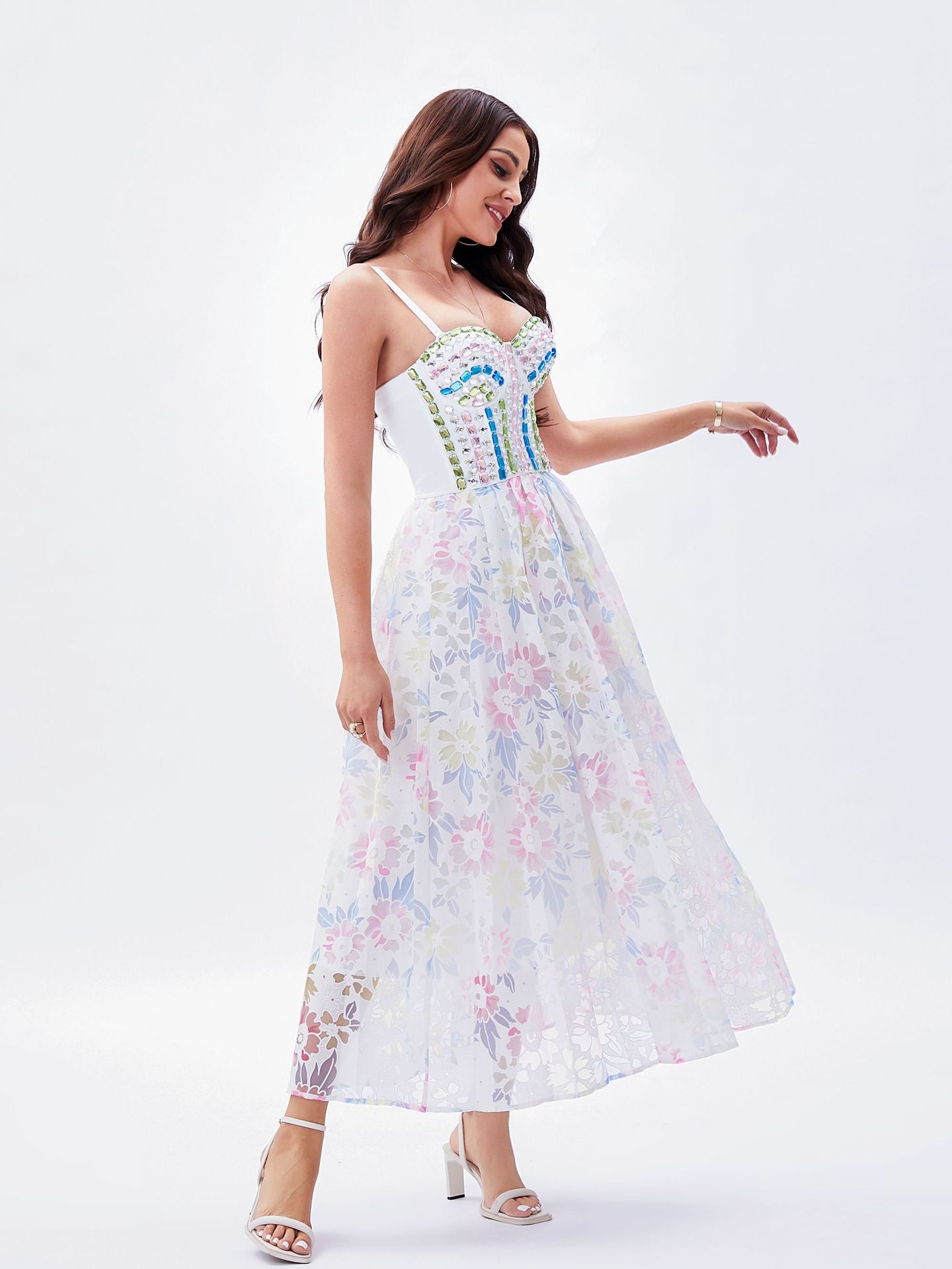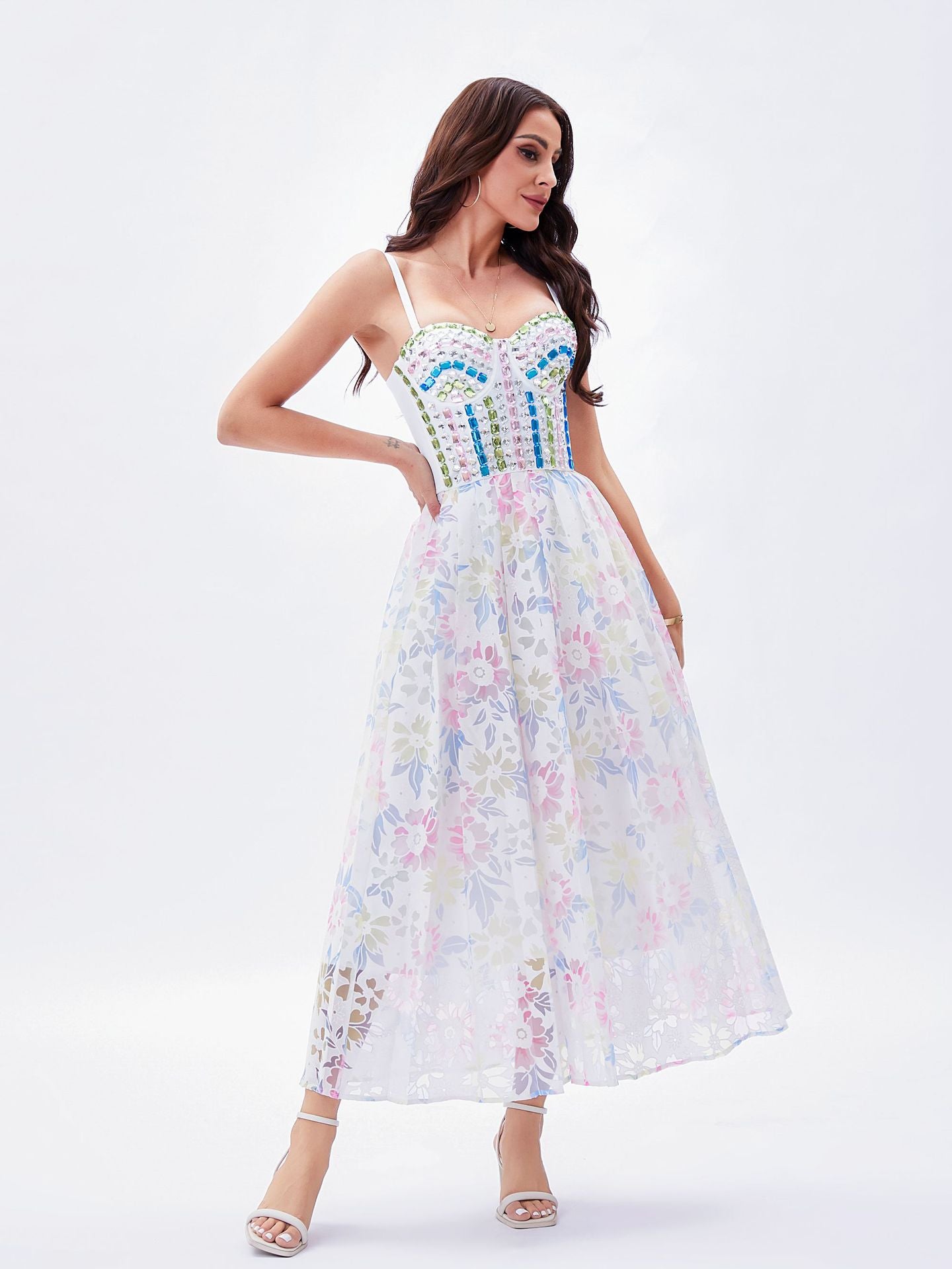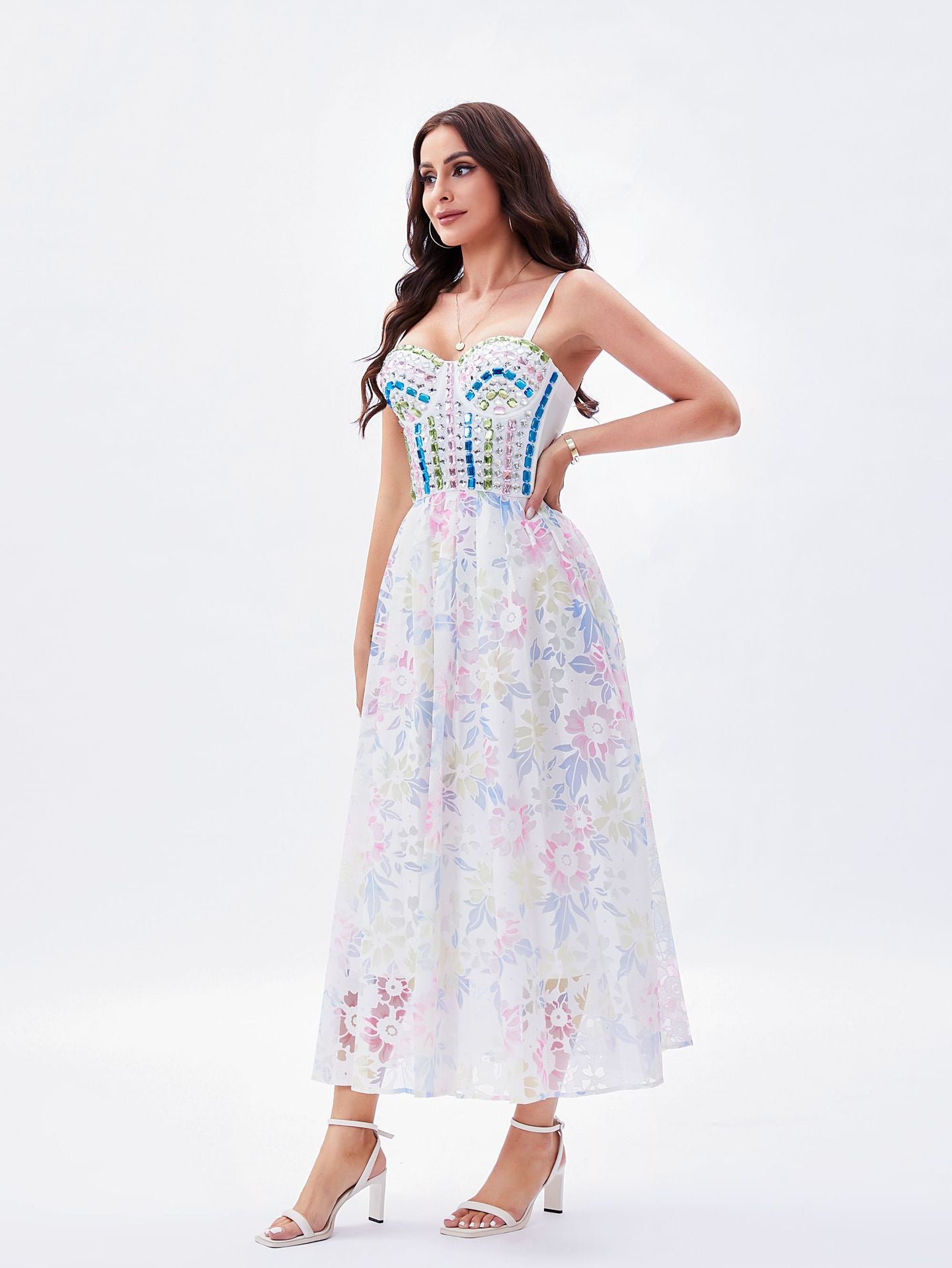 فستان أنبوبي مزين بحبات مستوحى من العطلات الرومانسية الفرنسية، مع تفاصيل ثلاثية الأبعاد للأزهار، وكورسيه مدعوم بعظام لتحديد الخصر، وفستان أميرة مع حمالات