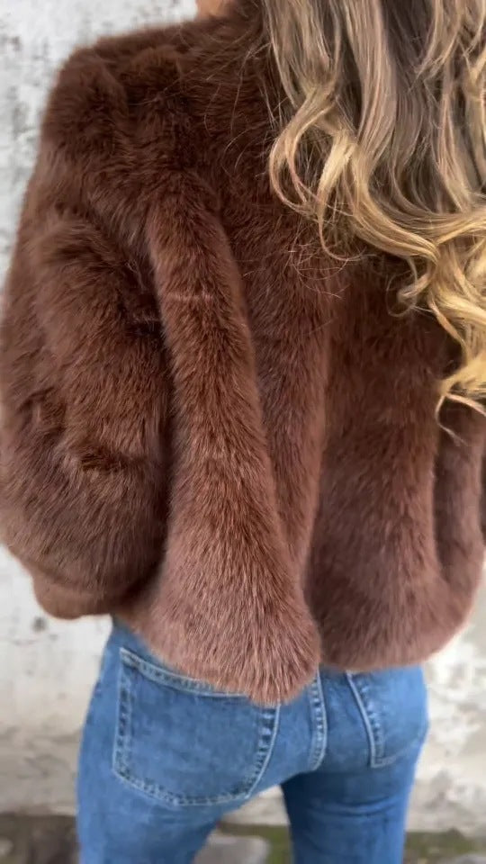 معطف علوي كاجوال من الفرو الصناعي مع ياقة مدورة وسحاب