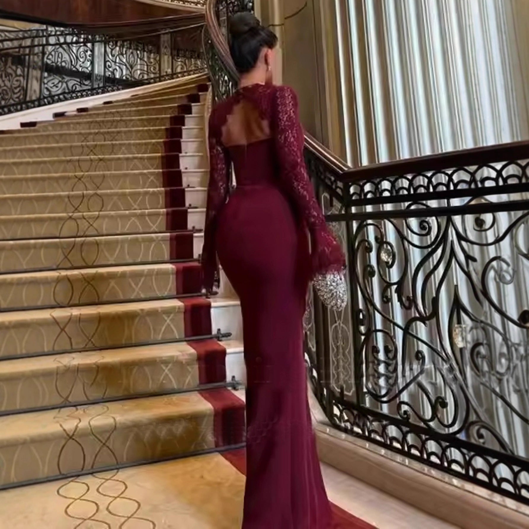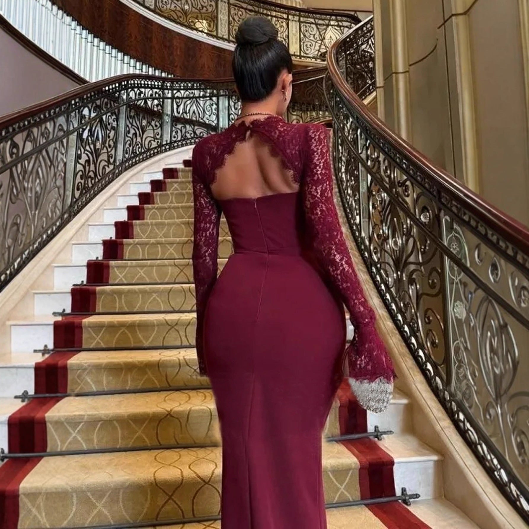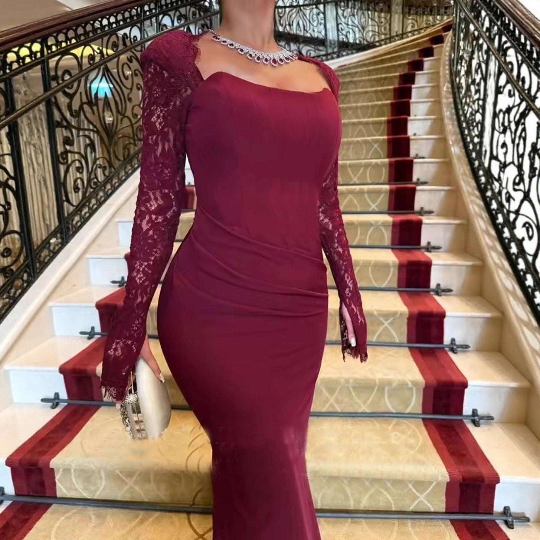 Long Sleeve Lace Red Dress