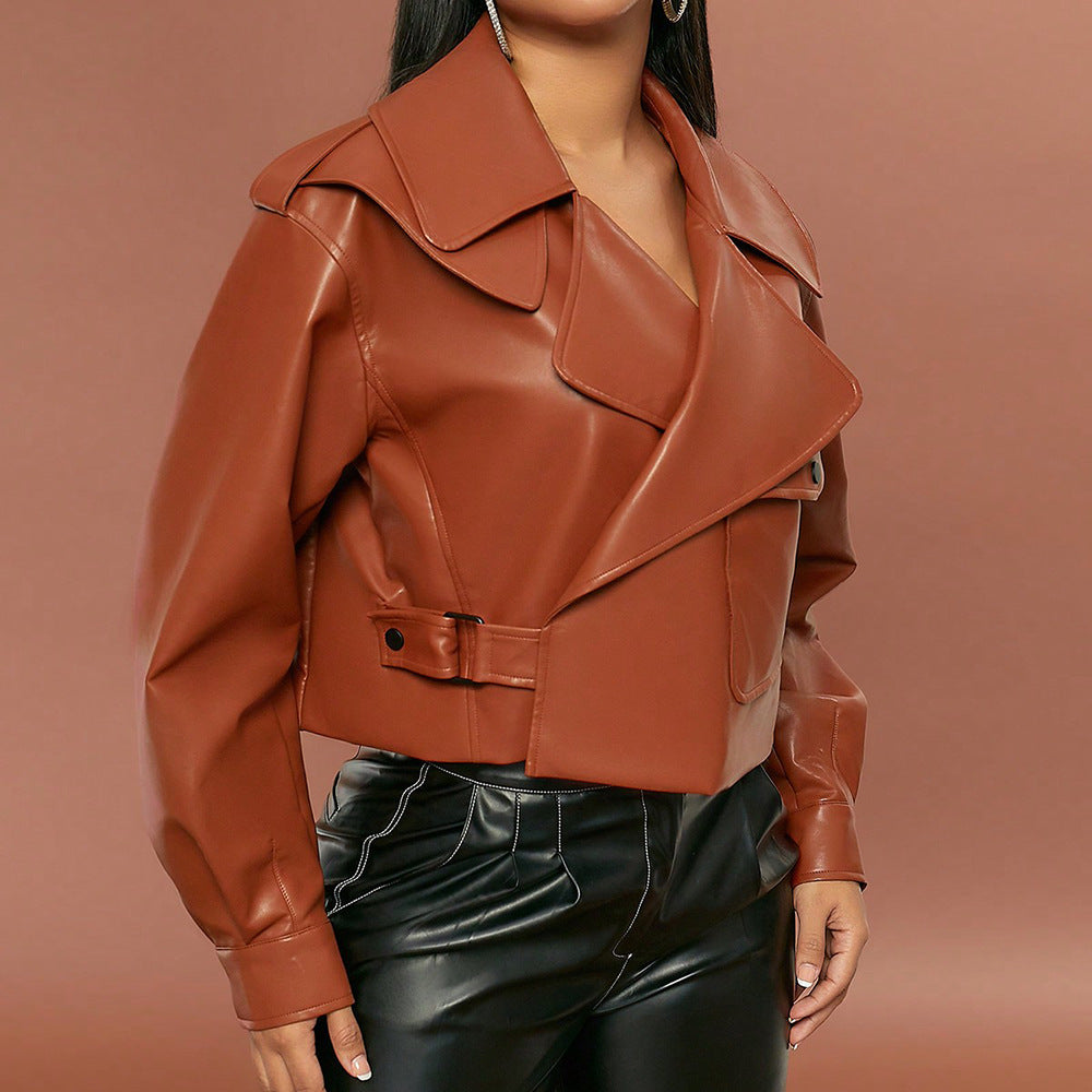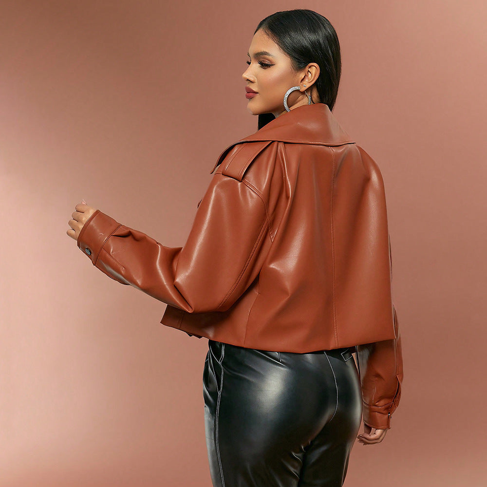 Casual Jacket Women Faux Leather Collared Long Sleeve Loose Leather Coat Coat