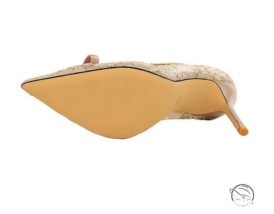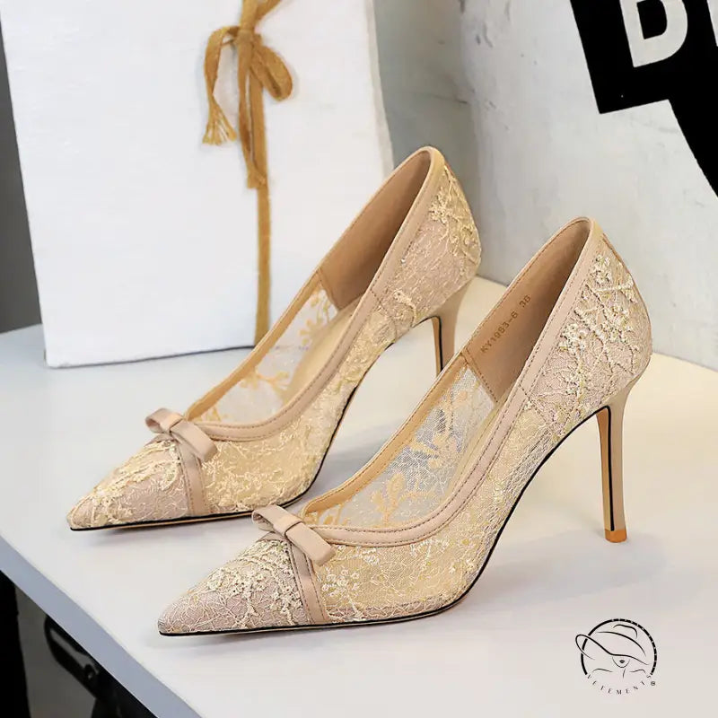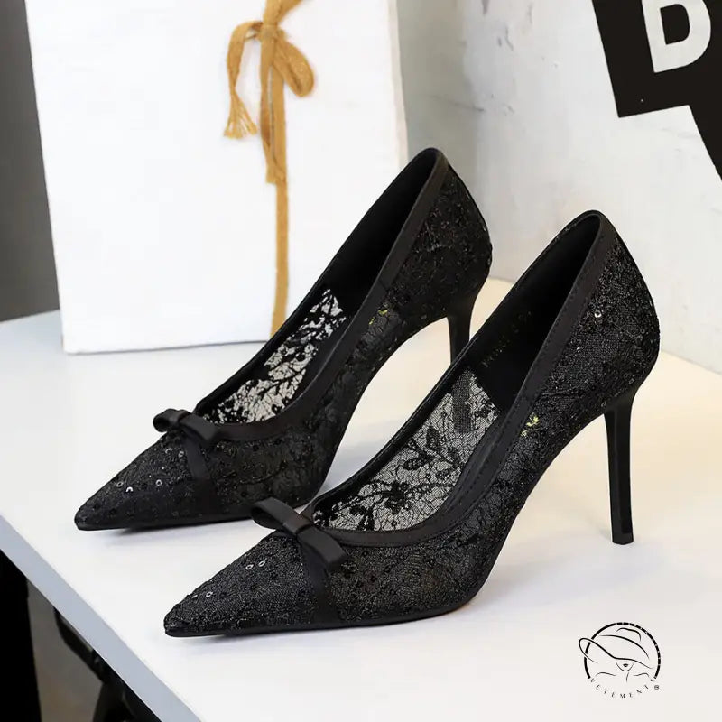 Cocktail High Heel Women Shoes Bow Sequined Lace Mesh Pointed Shallow Mouth Stiletto Heel