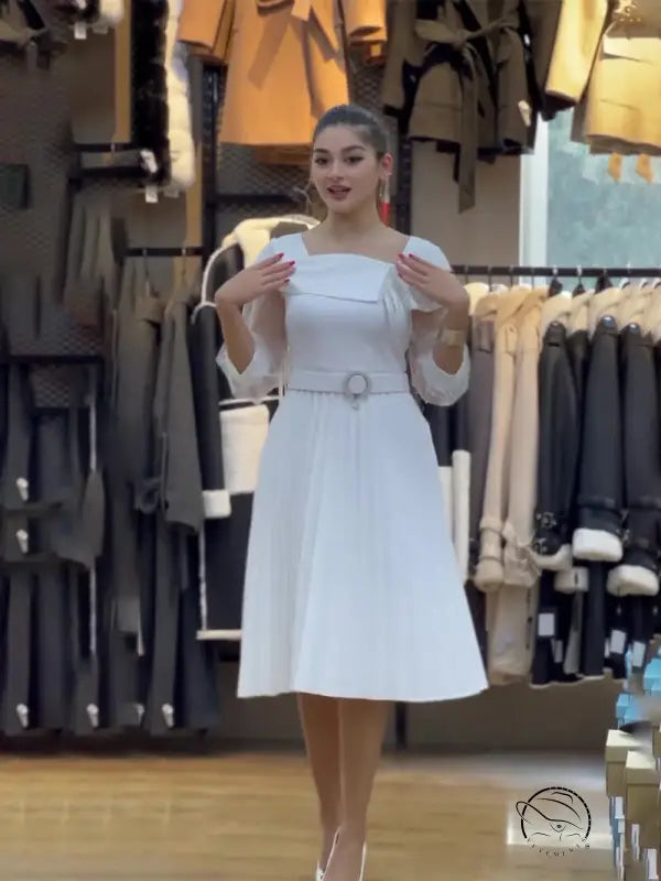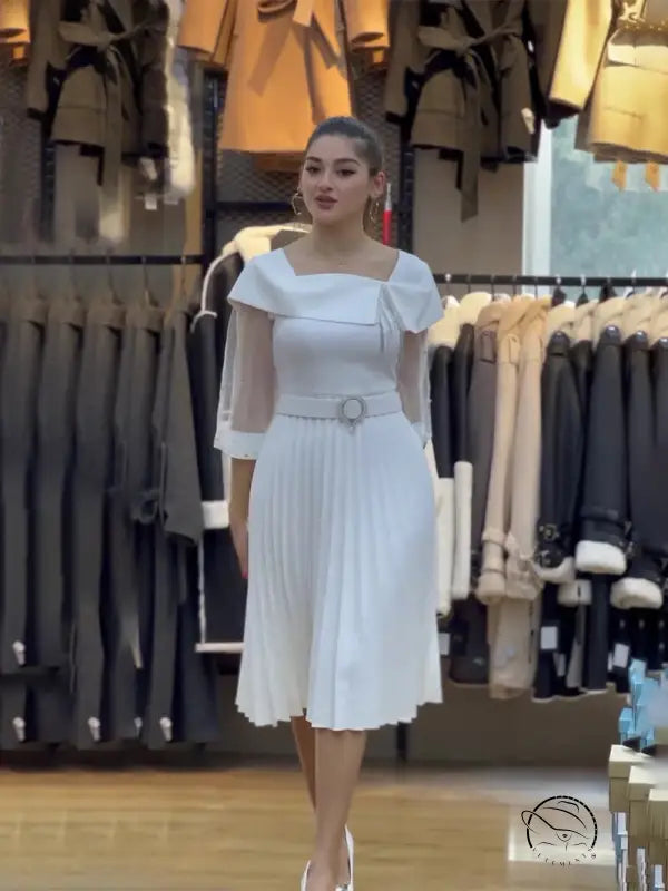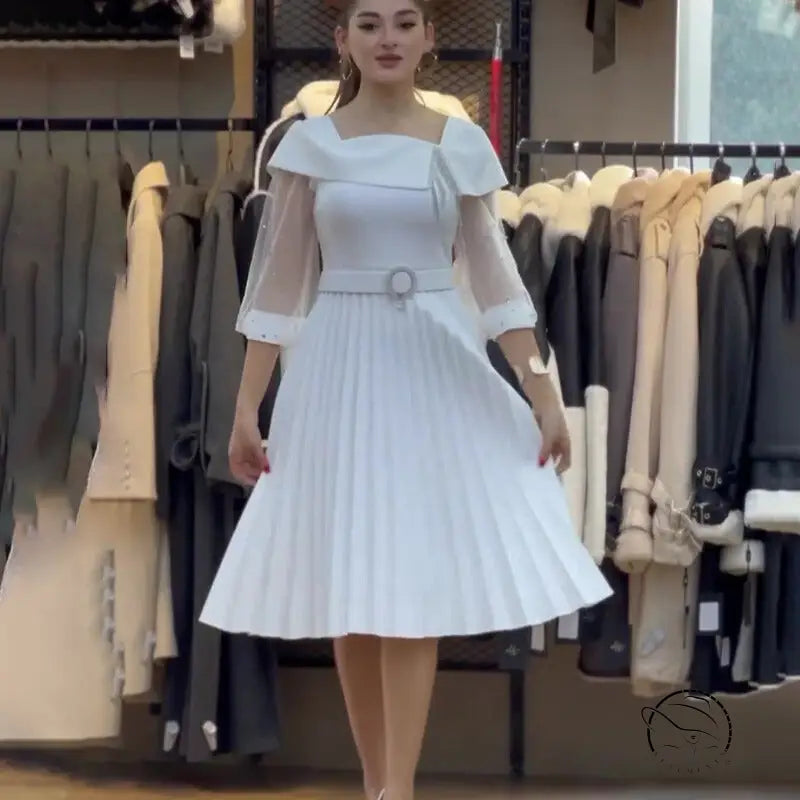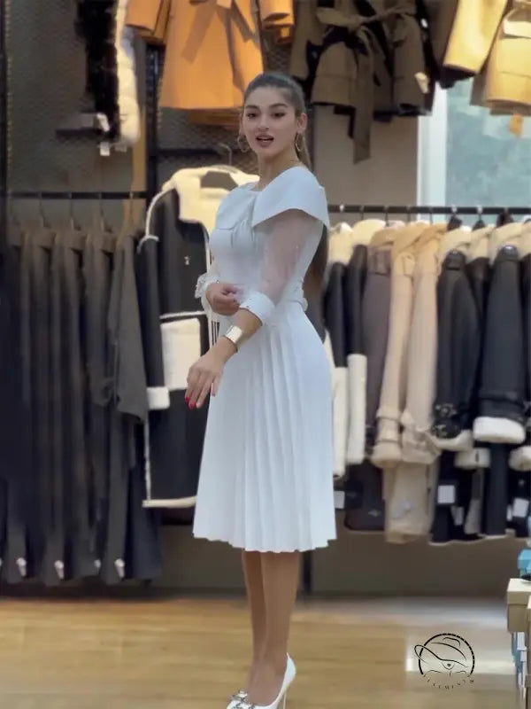 Elegant White Mesh Dress with Belted Patchwork Design for Any Occasion